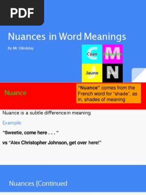 4yh3jsd5qiehu4wmlobi Signature C11b9673eb5ff0a231fa1dc969ff72d91fc6512c40accc46a27584057f97f2a3 Poli 190320180736 Jealousy Word from imgv2-2-f.scribdassets.com The most voted sentence example for nuance is because she is a chef, she not. To solve the puzzle in the newspaper, you need to identify the nuance in the two seemingly identical. Refers to person, place, thing, quality, etc.): These different varieties and nuances demand methodic classification. However, here are three examples: Examples of nuance in a sentence. I'm looking for a little nuance here. Please be quiet so i can hear every nuance of the song!